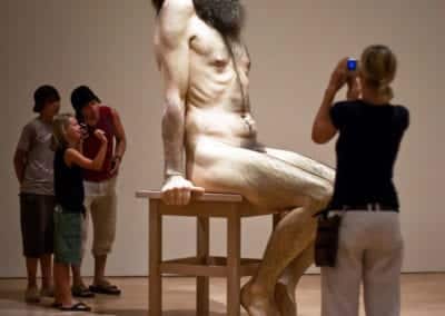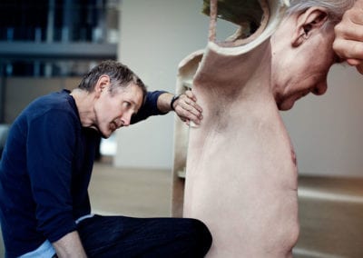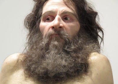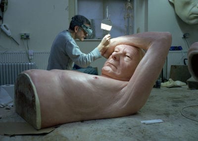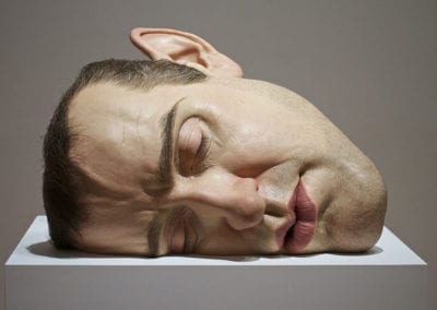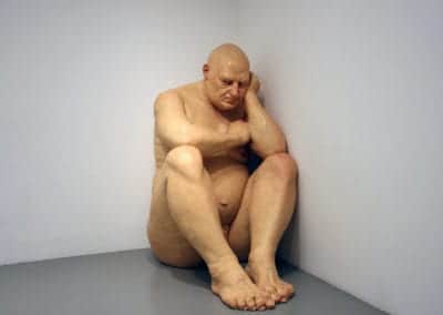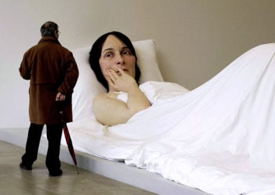 London-based sculptor Ron Mueck is known for his super-realistic yet fantasy-like sculptures. He often portrays humans at developmental of life, from birth through middle age, to death. In works that are either monumental in scale or severely undersized, he explores the human condition and psyche, often conveying feelings of loneliness, vulnerability, and alienation.