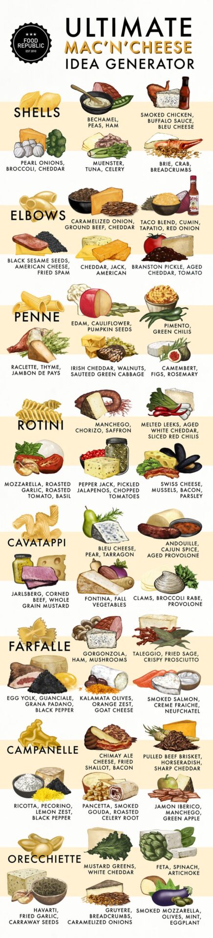 Get inspired to mix up your macaroni & cheese with this cheesy visual chart: Ultimate Mac & cheese Idea Generator!