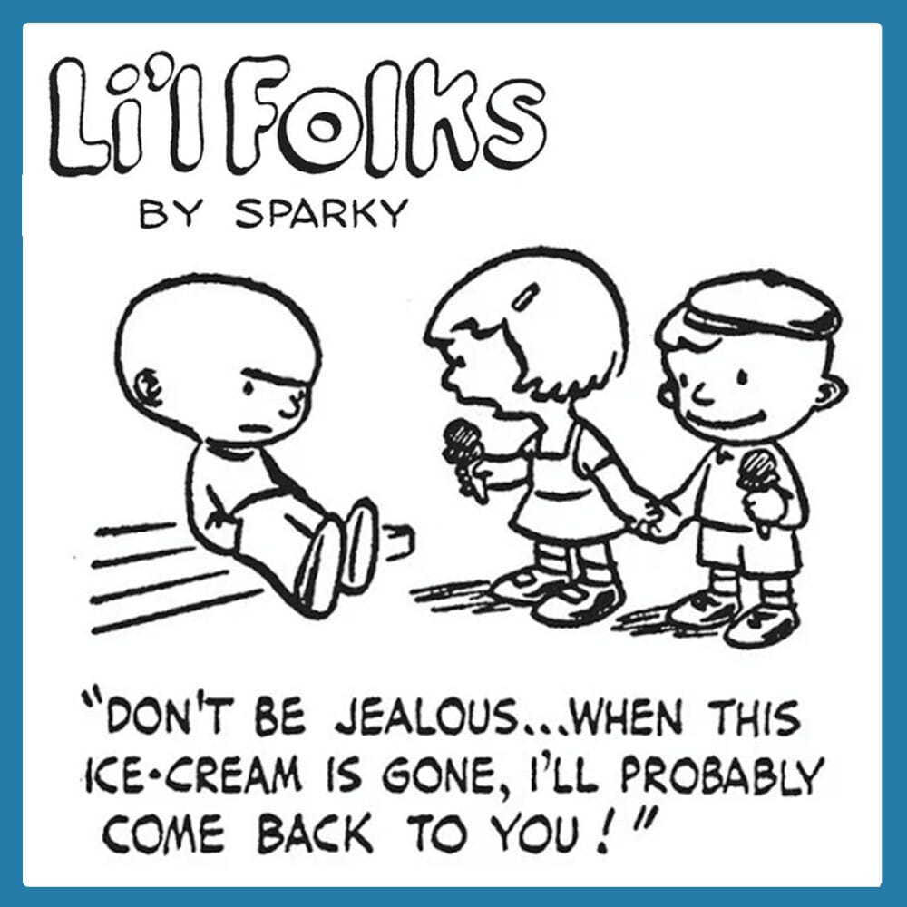 Schulz’s first group of regular cartoons was weekly series of one-panel jokes entitled Li’l Folks. It was Published in the St. Paul Pioneer Press. Each publication consisted of four, one-panel drawings.